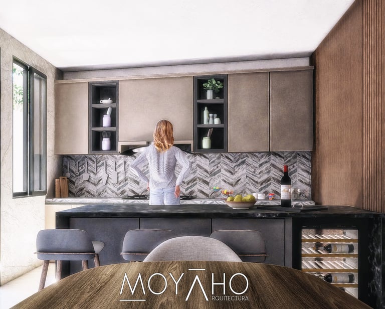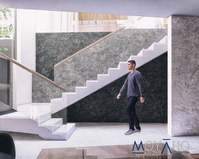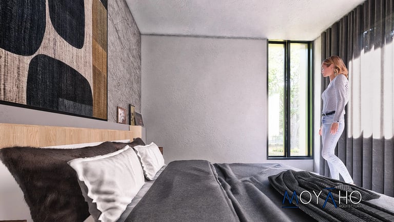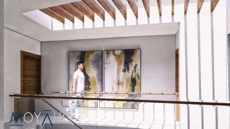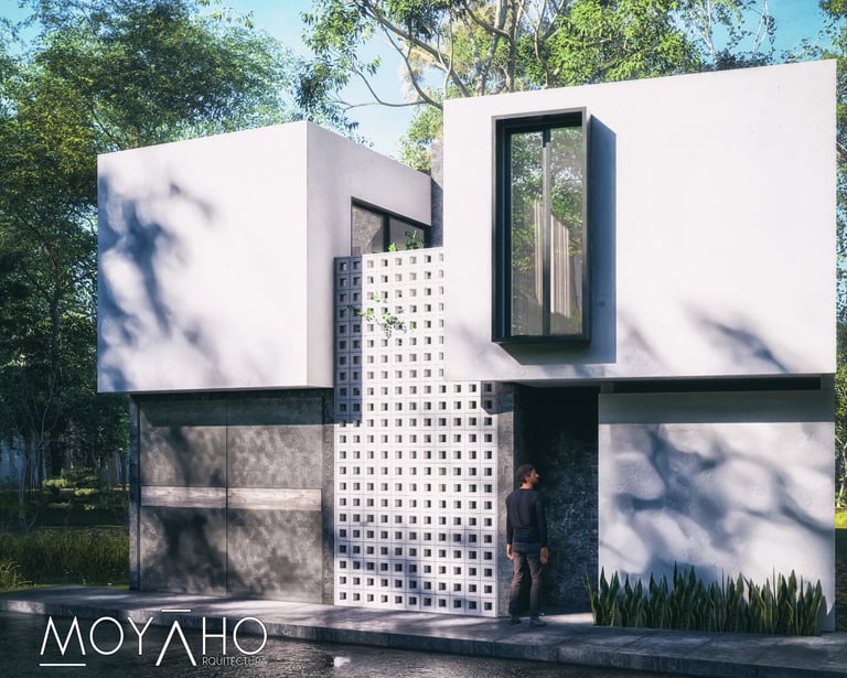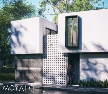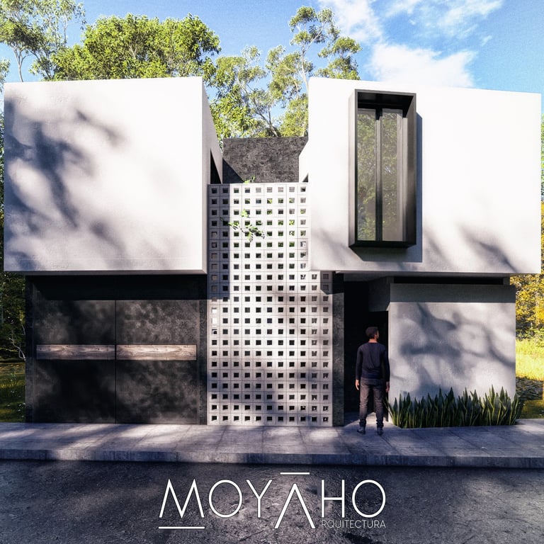 Casa de carácter minimalista que aprovecha la irregularidad del terreno mediante la creación de dos ejes constructivos principales. Estos ejes conforman dos volúmenes cúbicos en fachada, cuya intersección da origen a una linternilla central que introduce luz natural a las áreas comunes en planta alta y la conduce hasta la planta baja, potenciando la espacialidad y la continuidad vertical del proyecto.